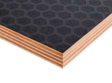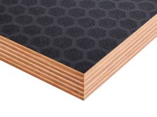 Листы изготавливают из березового шпона, склеенного фенолформальдегидным клеем, с нанесением ламинирующей пленки и сетчатого покрытия на одну или обе стороны. Сетчатая поверхность обеспечивает противоскользящий эффект, что делает материал идеальным для полов и платформ. Фанера устойчива к влаге, перепадам температур, механическим нагрузкам. Береза придает высокую прочность, а ламинирующая пленка защищает от воды, химикатов, истирания. Толщина листов — от 6 до 40 мм, стандартные размеры — 1220х2440 мм или 1500х3000 мм. Материал легко режется, но сложнее поддается тонкой обработке из-за покрытия. Экологичность ограничена из-за фенольного клея, поэтому фанеру редко используют в жилых помещениях. Высокая износостойкость и противоскользящие свойства делают ее востребованной в транспорте и строительстве.